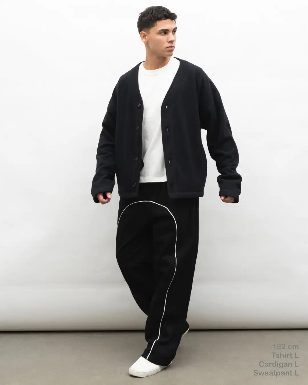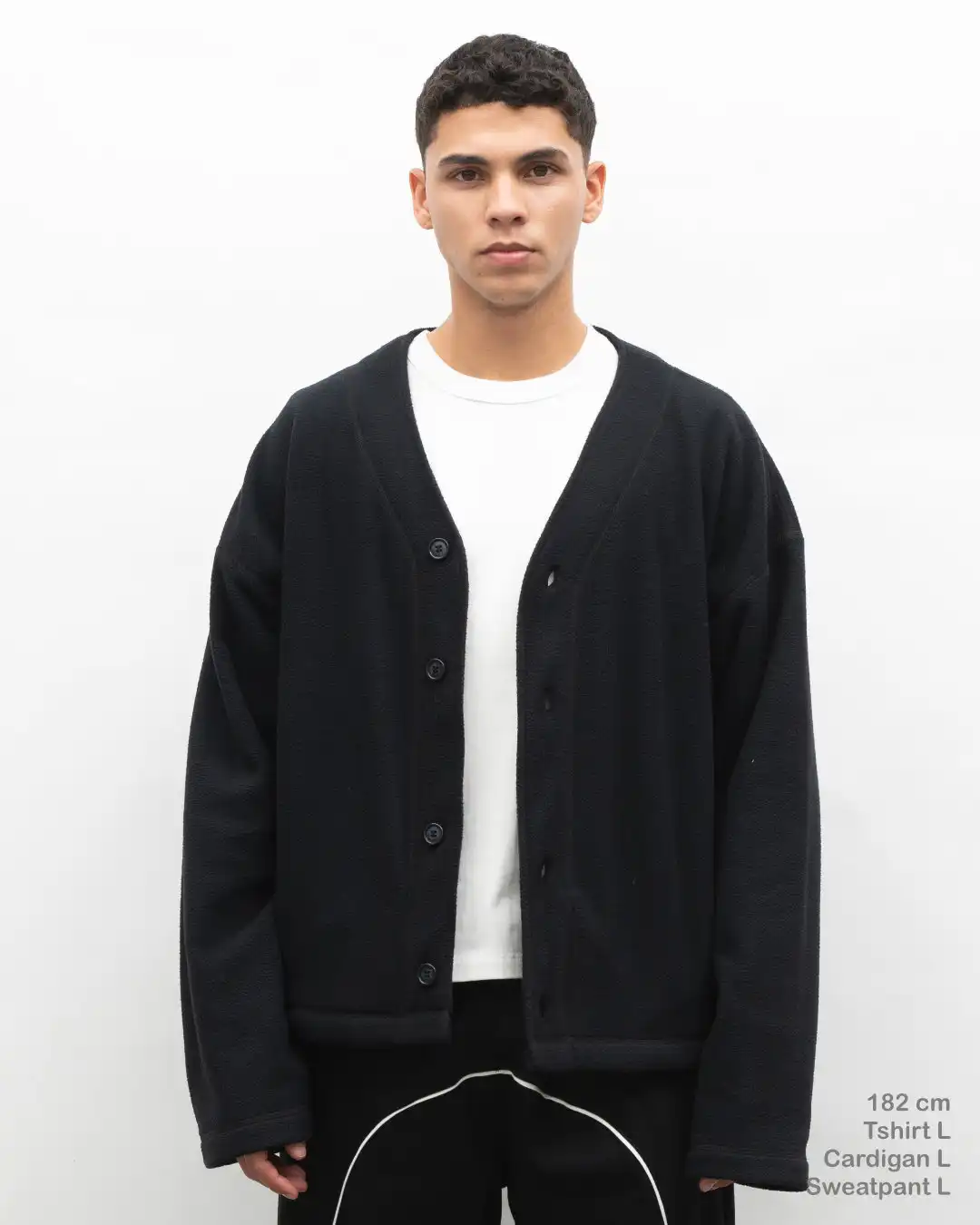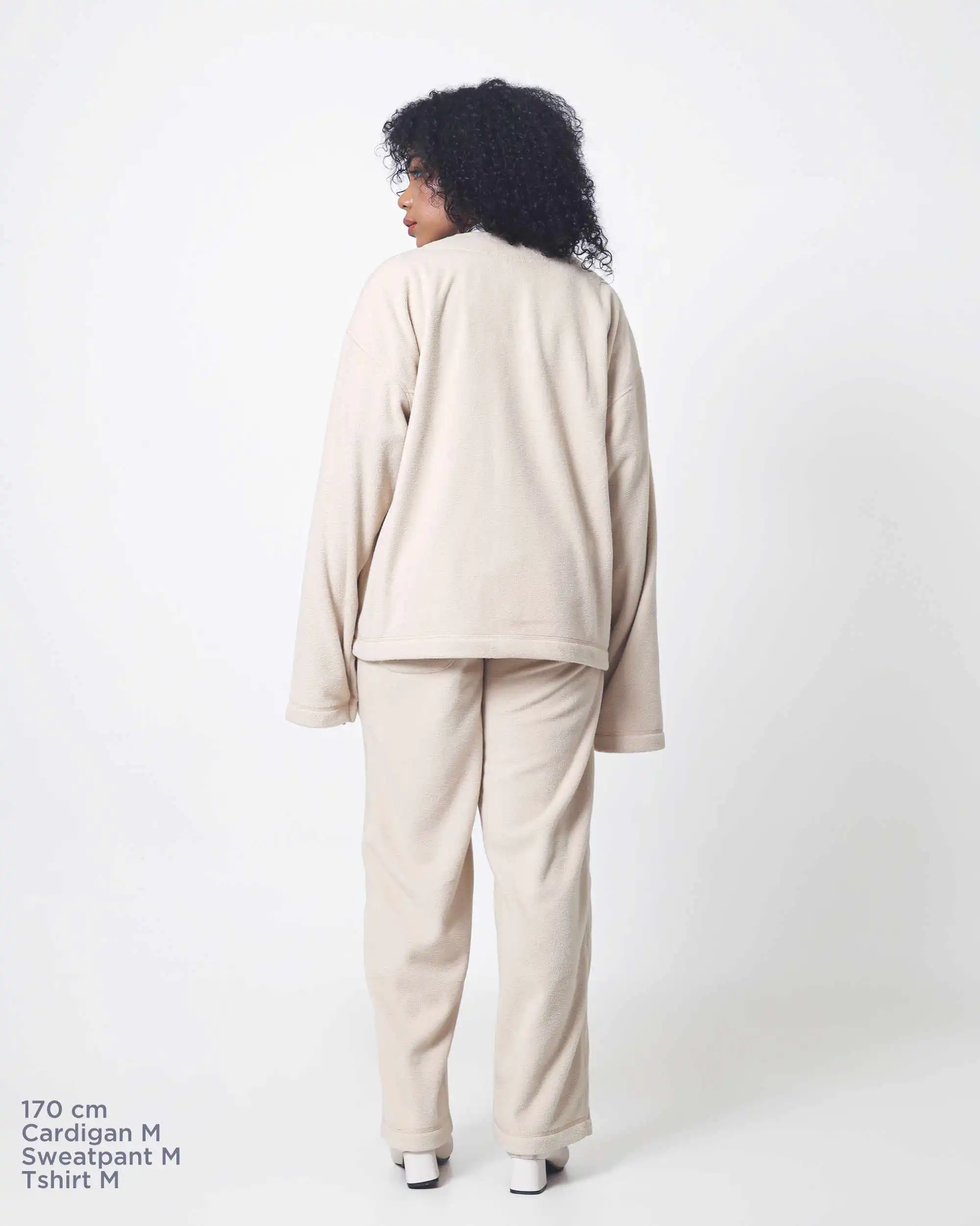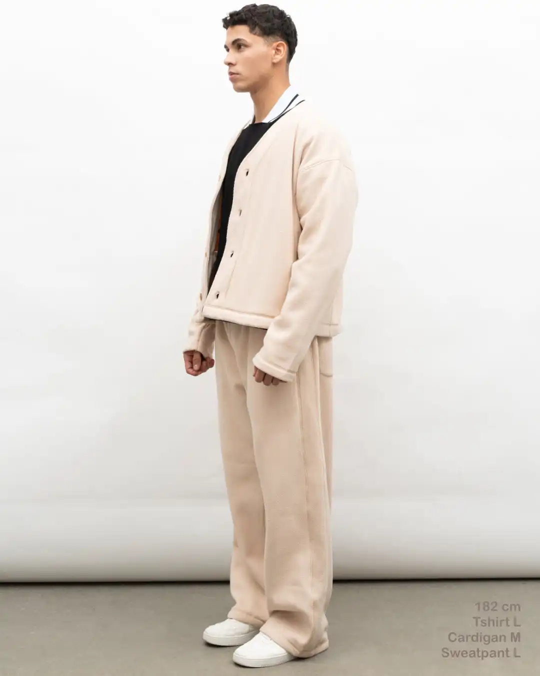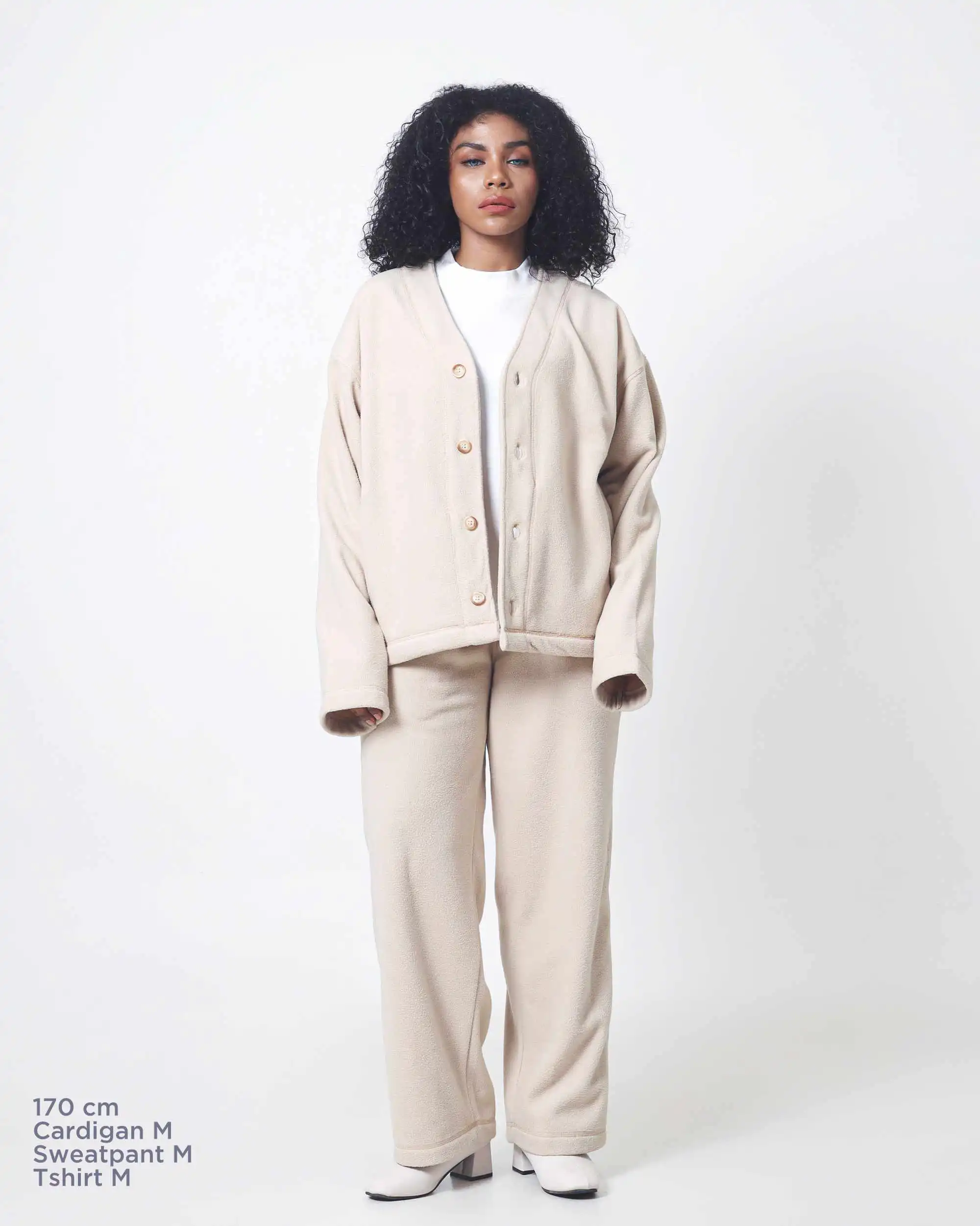 Terbuat dari Fleece Poliester Premium, lembut dan halus saat disentuh, memberikan feel cozy tanpa terasa berat. Teksturnya rapi dan stabil menjaga bentuk boxy tetap on point.